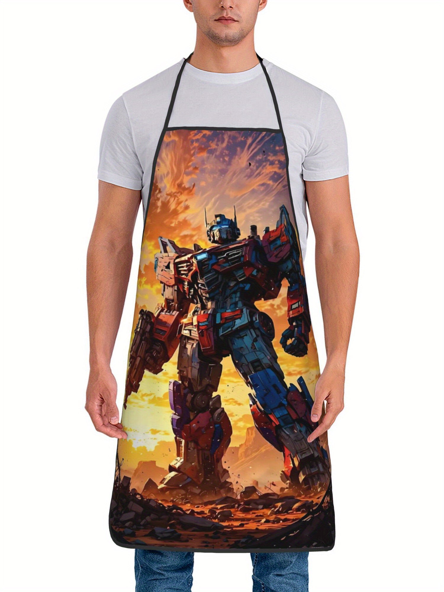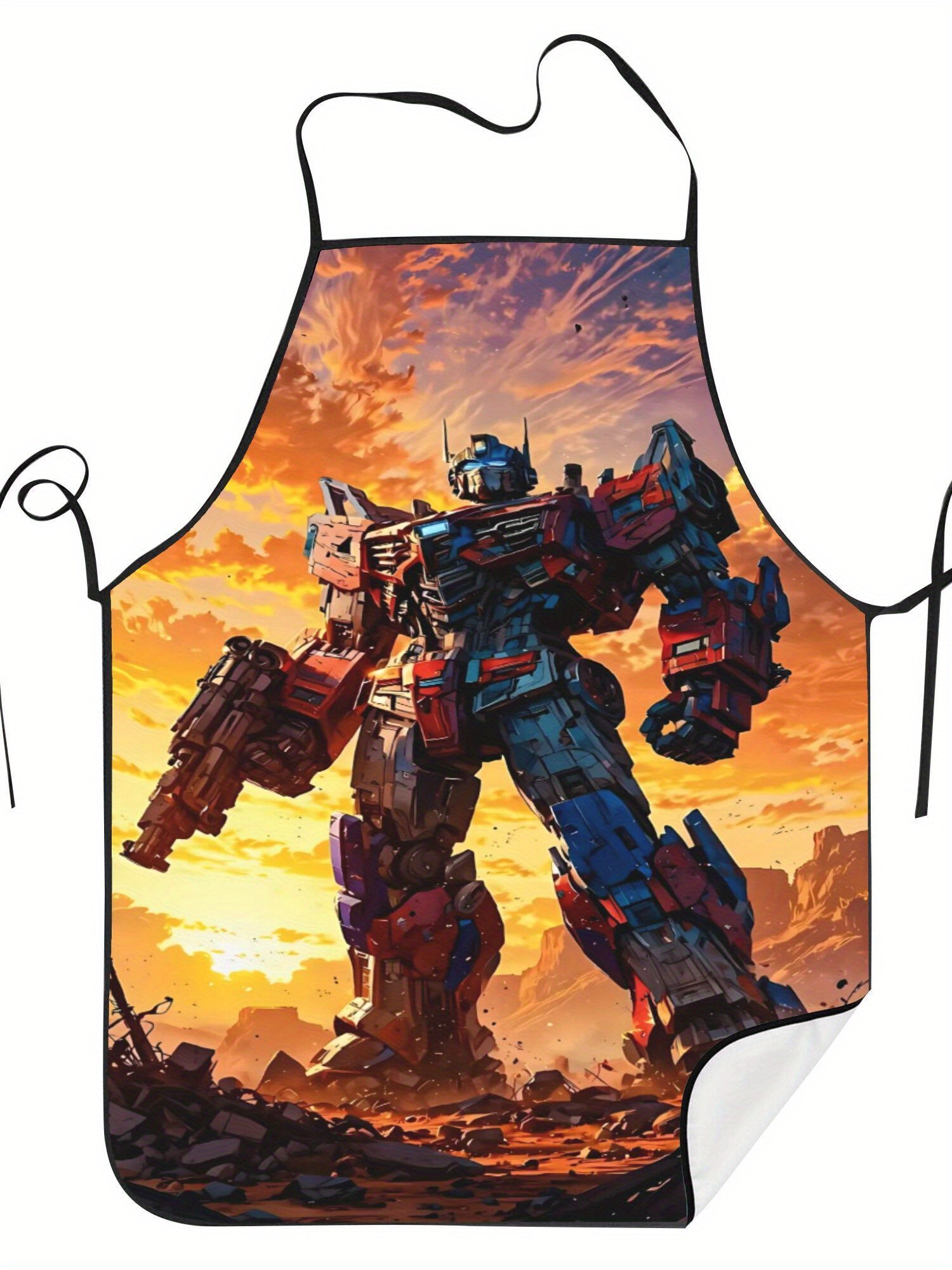 Este delantal presenta a Optimus Prime , el líder de los Autobots, listo para la acción. El diseño lo muestra en plena posición de combate, blandiendo su icónico cañón bláster , con un estilo moderno y enérgico.