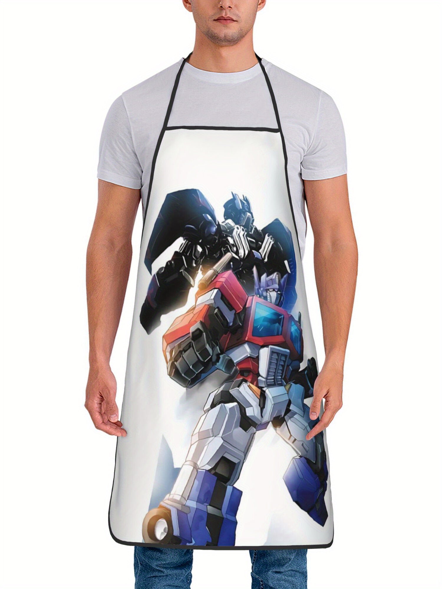 Este delantal presenta un dúo icónico del universo Transformers sobre un fondo blanco brillante que le da un toque moderno y elegante. Perfecto para mostrar tu pasión con estilo mientras cocinas.